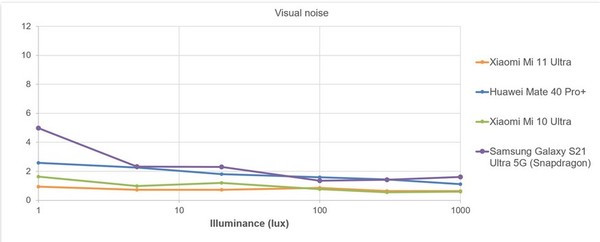 我们的实验室测试证实了真实场景测试的结果。由于小米11Ultra内置具有大像素的大传感器和高效的处理软件,因此该手机在所有光照水平下都能够将噪点控制在比竟品都要低的水平上。