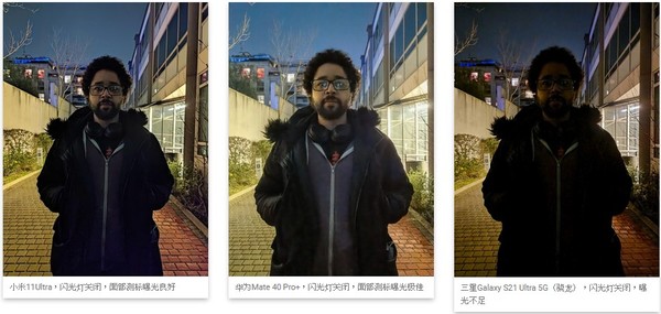 小米摄像头在拍摄夜景方面表现得非常出色。在如下HDR场景中,测标曝光效果很好,可以在被摄体上拍出不错的曝光度,同时也可以在较亮的背景中保留到位的细节。相比之下,华为的面部测标曝光稍微更好,而三星则曝光不足。