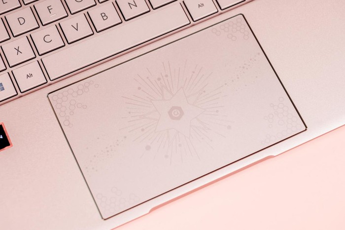 除了用“香”取悦你对品质美学的极致追求,华硕a豆14 Air 香氛版携手法国娇兰共创美学设计,视觉化呈现“光之美学”。机身A面拥有「蜂巢绮光」设计,以六角蜂巢为视觉焦点,蜂胶晶莹缀于边缘,光芒图案如晨曦绽放,与adol logo花瓣旋舞交融。C面触控板采用「星芒触境」设计,以蜂巢纹理勾勒轻盈边框,星光流转其间,指尖按压、点触,即可绽放属于你的从容自信光芒。