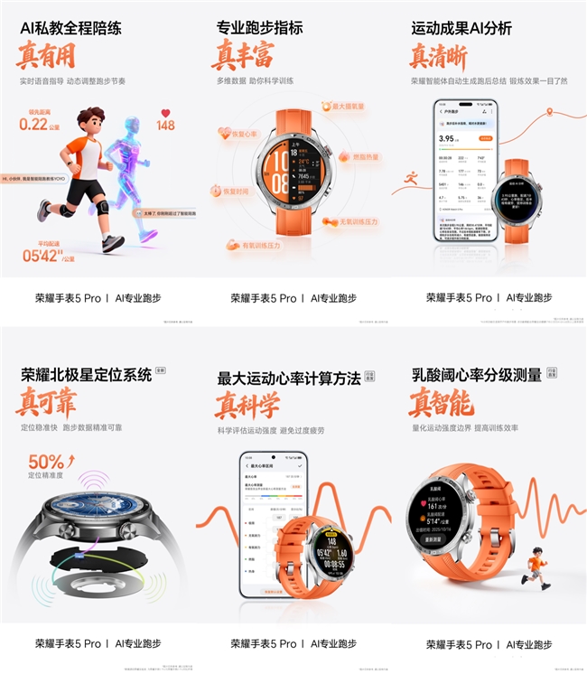 荣耀手表5 Pro是荣耀今年10月15日上市的一款旗舰智能手表,在运动体验方面全面升级,为广大跑步运动爱好者带来了行业最强AI专业跑步解决方案。荣耀手表5 Pro可支持实时监测运动健康核心数据,结合海量跑步数据为跑者定制更有针对性的个性化训练运动计划,全程指导跑步训练,跑前科学规划,跑中实时监测指导,跑后AI归纳解析运动数据,堪比随身私教。深马赛事期间,荣耀运动健康APP将在社区同步上线“深马荣耀时刻”话题互动专区及“深马线上一起跑”系列活动,邀请跑者共赴荣耀征程,并通过“运动赛场”的热门运动路段导航、AI跑步计划、赛前赛后拉伸运动课程等功能,以数字平台连接赛道内外,让不同段位、等级的马拉松跑者都能在荣耀手表5 Pro的陪伴下科学备赛训练,不断突破自我。