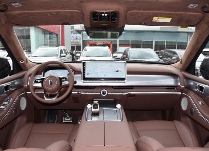 内饰采用暗红色材质,顶篷和腰线以上立柱采用翻毛皮材质,中控台和副仪表台则配备了银色铝制饰板,凸显出硬派特有的豪华高贵气质。屏幕为悬浮式大屏以及液晶仪表,标志性的坦克风格物理按键也没有缺席。