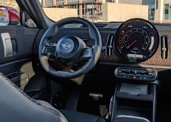 进入车内,全新MINI JCW COUNTRYMAN简约的设计语言使座舱看起来更开阔,圆形的方向盘、中控屏与纵置的空调出风口, 搭配12个超声波传感器和4个环视摄像头,可实现L2级驾驶辅助功能。