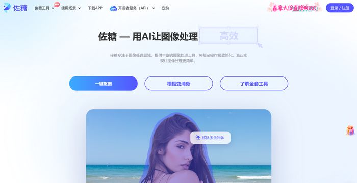 在图片处理方面,佐糖是一款无比方便的Ai图像处理工具,包括一键抠图、一键移除多余物体、图片修复、模糊变清晰、黑白照片上色、背景更换等多种功能,非常全面。如果是工作中需要经常进行图片处理的小伙伴,这款工具对你来说非常合适。