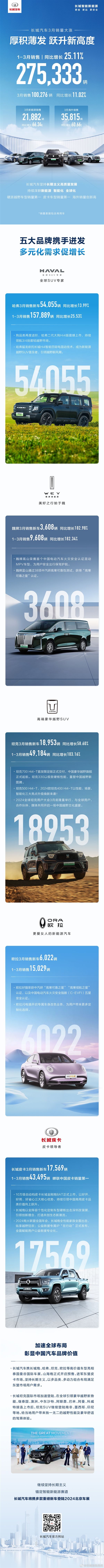 数据显示, 长城汽车3月份销售100,276辆,同比增长11.02%, 1-3月销售275,333辆,同比增长25.11%。