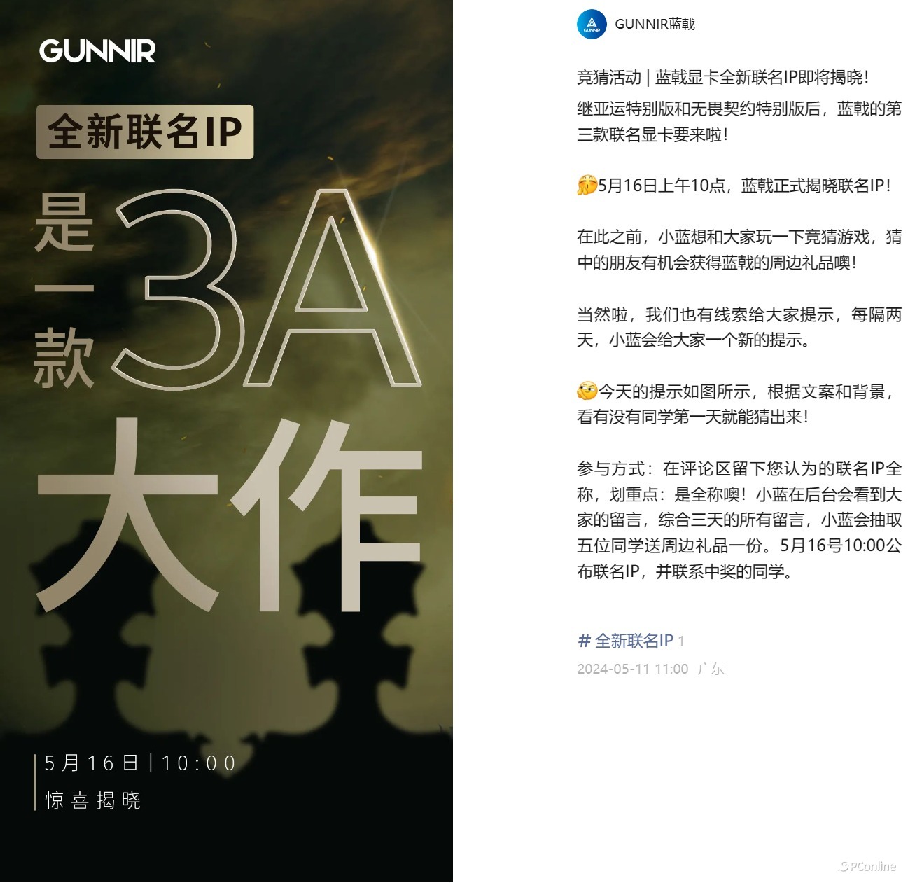 近日, intel显卡合作伙伴蓝戟GUNNIR宣布又有全新IP联名的显卡了,这是继亚运特别版和无畏契约特别版后,蓝戟的第三款联名显卡,蓝戟在其官方公众号上举行了关于联名IP的竞猜活动。