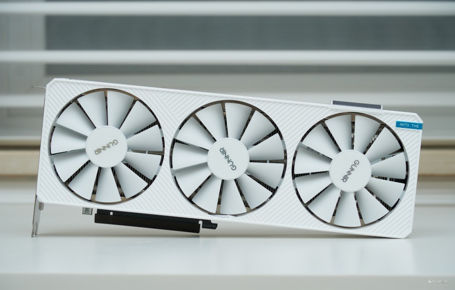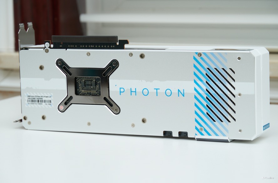 显卡背面则有白色的加固背板,背板上印有显卡系列 PHOTON的蓝色LOGO与装饰条纹,整体仍遵循着Less is More的简洁美学,而且这个背板是真的适合做联名卡。