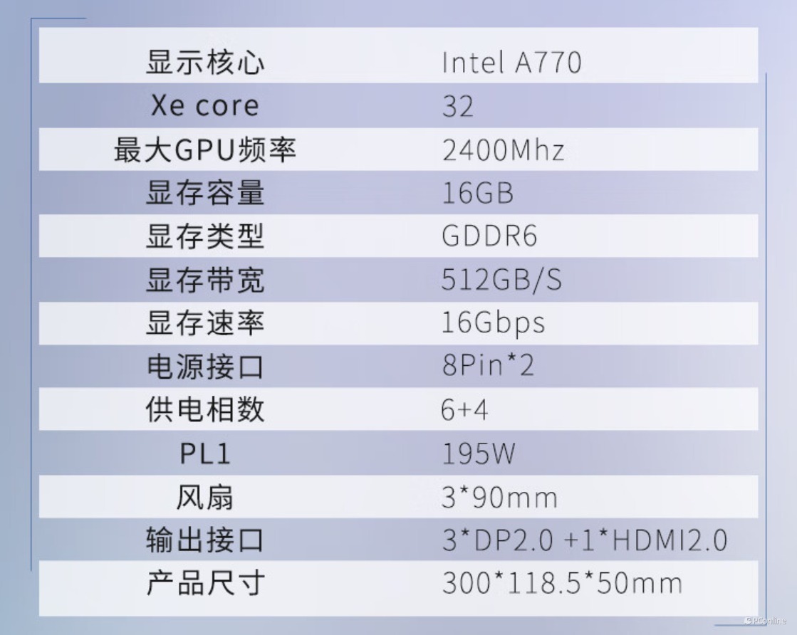 蓝戟 intel ARC A770 PHOTON的硬件参数十分出色,其拥有32个Xe核心加持,GPU频率最高可达2400MHz。搭载 16GB的GDDR6显存,显存位宽256bit,带宽512GB/s,超大显存容量可以轻松应对3A级别的游戏大作。