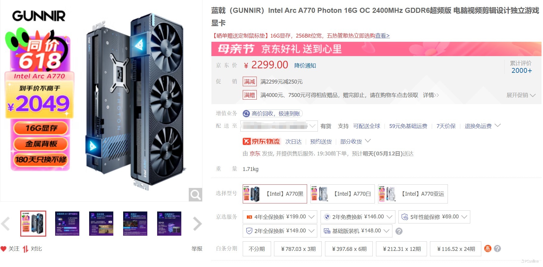 目前,蓝戟A770 Photon显卡在京东旗舰店的优惠价格为2049元,这款显卡不仅外观精致,更具备了旗舰级硬件配置,能够提供强大的性能体验。它所搭载的16GB显存容量,使其在同价位产品中脱颖而出,能够轻松应对高特效和高画质的大型游戏,对于追求高性能显卡的玩家来说,这是一个不容错过的选择。