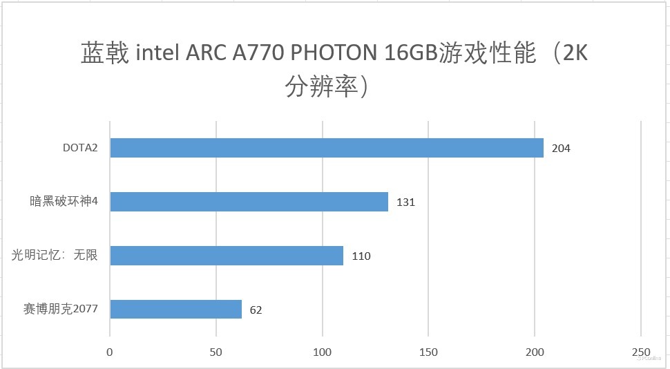 得益于XeSS超分辨率技术的加持,蓝戟 intel ARC A770 PHOTON游戏表现也十分出色,在2K分辨率下,哪怕是号称显卡杀手的《赛博朋克2077》也能够有62FPS的平均帧率,《光明记忆:无限》与《暗黑破坏神4》中有着110FPS与131FPS的高平均帧率,在电竞网游《DOTA2》中更是可以有着200FPS +的超高帧率,游戏性能十分强劲。