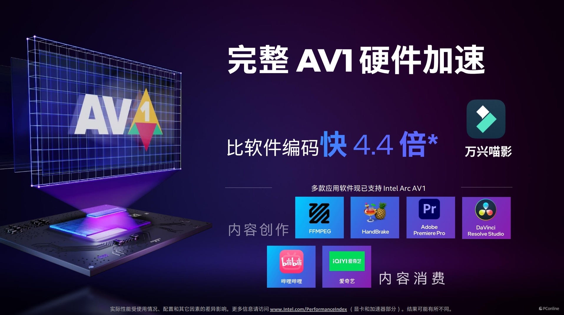▲除了游戏方面,蓝戟 intel ARC A770 PHOTON在生产力方面也获得了专业人士的认可,其支持完整的AV1硬件加速,目前PR、达芬奇、以及国产的万兴喵影等视频剪辑软件均已官宣支持AV1 Intel ARC显卡的硬件加速,16GB的超大显存更是让电脑的生产力如虎添翼。
