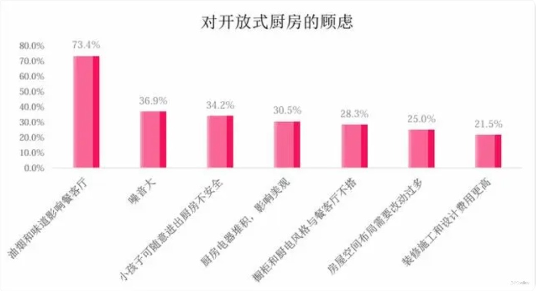 近日,由中国社会科学院国情调查与大数据研究中心发布的《家庭中心:中国厨居发展趋势报告(2024)》(以下简称报告)中指出,厨房正在取代客厅成为家庭新中心,开敞式厨房成为近八成人的选择,但油烟、噪音、安全性等清洁痛点却让人对美好厨居止步于想象:报告调查显示,受访者中担心油烟和味道会影响到客餐厅的占比高达73.4%,担心噪音的占比36.9%,担心孩子进出厨房的安全性的占比34.2%。