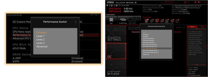微星独有的 Performance Switch 超频功能也已在 MSI BIOS 中为 AMD Ryzen 9000 系列处理器做好准备。 Performance Switch 提供三个等级的预设和一个进阶选项供使用者选择,将 AMD 预设 Precision Boost Overdrive (PBO) 与 MSI 的超频设定结合,更加增强单核心和多核心的 CPU运作效能。