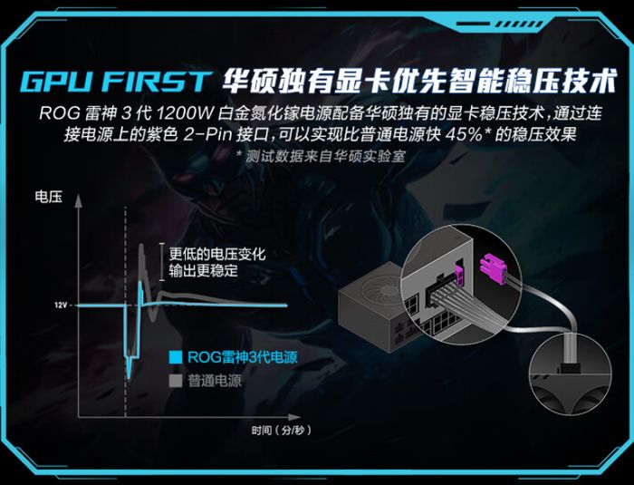 为保障主机稳定性和安全性,ROG 雷神3代1200W 氮化镓白金电源在配置方面可谓非常强悍!搭载华硕独有的显卡稳压技术+氮化镓晶体管,有效消除电压波动影响,安全性MAX!