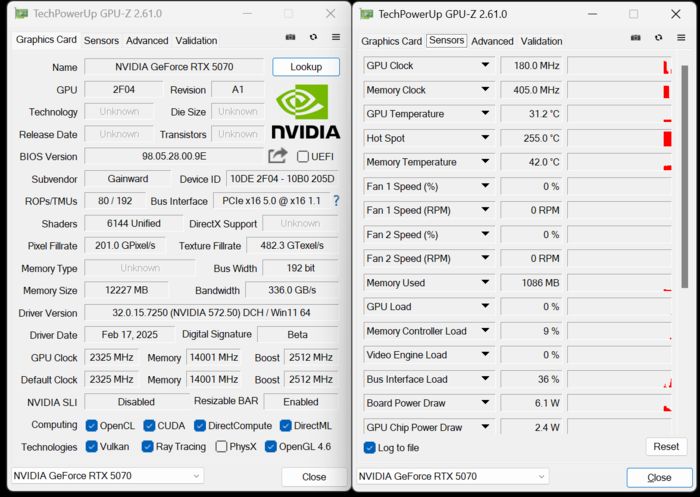 由检测软件GPU-Z可看到耕升 GeForce RTX 5070 追风更为具体的参数表现和实际规格。通过数据可以看到,在待机状态下,显卡温度为31.2℃,功耗为6.1W。