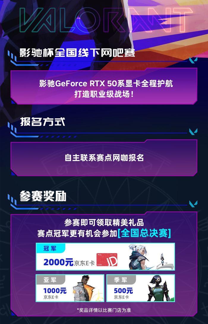 冠军队伍将获得2000元京东E卡,亚军为1000元京东E卡,季军为500元京东E卡(奖品详情以比赛门店为准)。比赛场地将采用全新的影驰RTX 50系显卡,保障参赛选手的帧率稳定不卡顿,让选手全力以赴,打出精彩的比赛。
