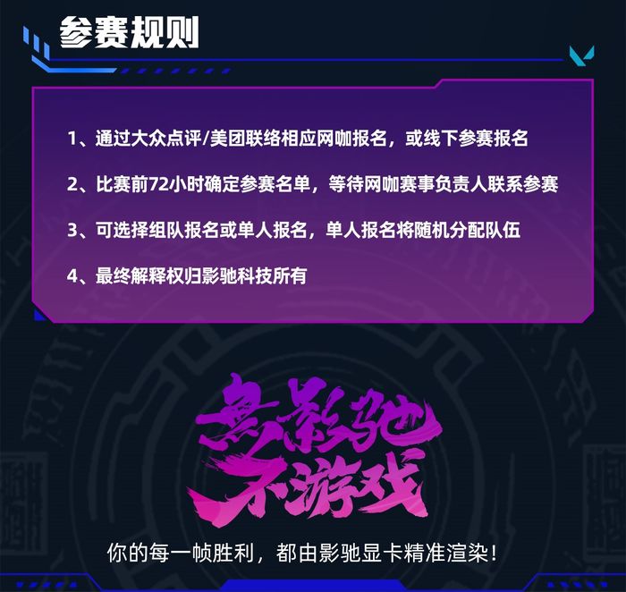本次影驰杯夏季巡回赛采用的游戏为《无畏契约》,该游戏是5V5的第一人称射击游戏,游戏模式采用竞技模式,每场比赛共四组,八支队伍,每轮通过淘汰制进行PK,分别分出冠亚季军队伍,获得相对应的奖品,而参赛的选手都能获得我们影驰周边哦~。