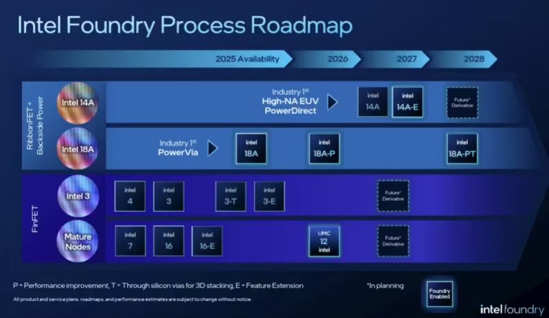 根据英特尔的官方路线图,18A-P 将在 2026 年推出,18A-PT 要等到 2028 年。14A 将在 2027 年到来,还会有 14A-E 工艺。在行业竞争方面,台积电的 2nm(N2)工艺预计 2025 年下半年量产,性能提升 10%-15%,功耗降低 25%-30%。英特尔的 14A 节点预计领先台积电一年推出,且将首次采用 High-NA EUV 技术。