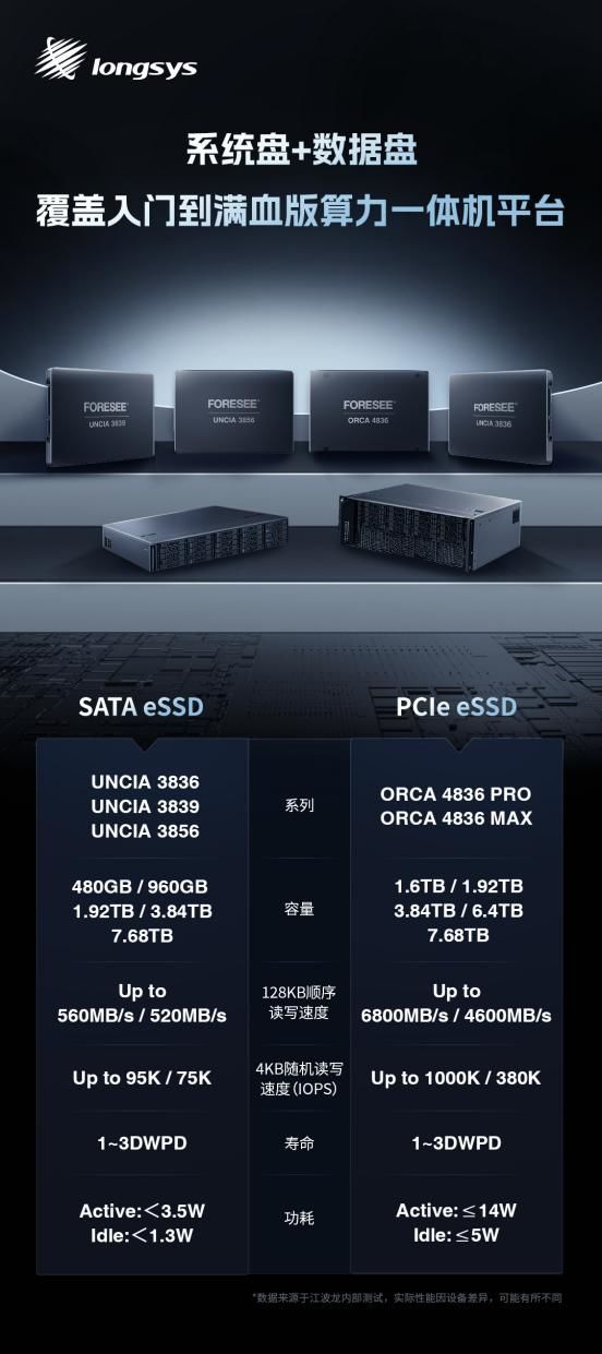 对于需要处理大规模推理数据集、用户私有数据、中间结果及日志存储的场景,江波龙的PCIe eSSD产品提供了更高的性能和容量选择。产品支持PCIe Gen4接口,容量范围从1.92TB到7.68TB,顺序读写速度高达6800MB/s / 4600MB/s,4KB随机读写速度高达1000K IOPS / 380K IOPS,能够显著提升数据读写效率。此外,江波龙的PCIe eSSD支持RAID 5配置,通过分布式校验技术确保数据的高可靠性。